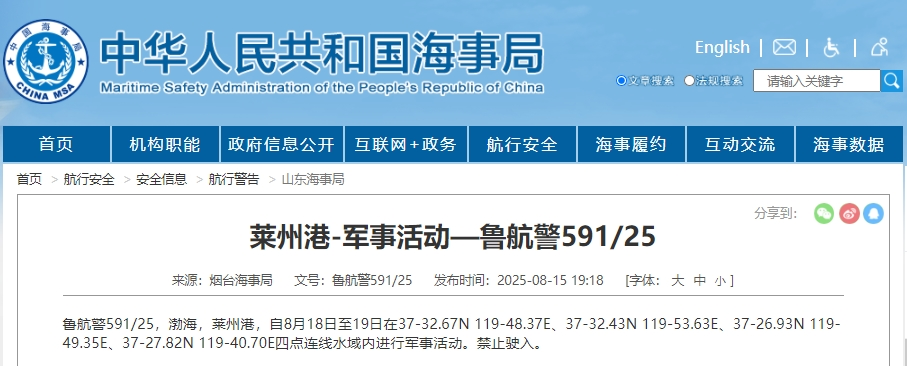 航行警告!明天起,渤海莱州港相关水域进行军事活动,禁止驶入 2025-08-17 08:48 中国海事局网站 0 据中国海事局网站消息,烟台海事局发布航行警告,8月18日至19日,渤海莱州港相关水域内进行军事活动,禁止驶入。 责任编辑:刘聪聪