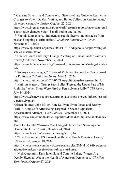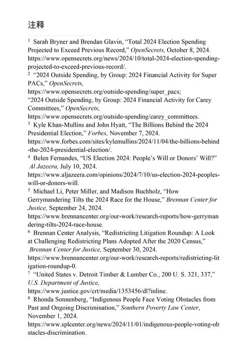 选举规则压制选民投票权利。南部贫困法律中心(Southern Poverty Law Center)网站2024年12月1日报道,2020年以来,已有24个州通过了压制选民的限制性法案,17个州通过了新的或更严格的选民身份证法。8这些法律在选民身份证明、邮寄投票等方面规定了过于繁琐的限制性要求,对老年人、少数族裔、残疾人、低收入选民和学生的影响尤为严重。9根据投票骑士组织(Vote Riders)的研究,美国有色人种公民缺乏投票所需身份证件的可能性接近白人的4倍。许多符合资格的选民无论政治派别如何,都会因为不了解他们居住地的选民身份证法而无法行使选举权。10布伦南司法中心(Brennan Center for Justice)2024年11月19日发布的一项研究报告显示,印第安原住民的投票率历来是所有群体中最低的,但美国政府始终未采取行动改善他们的投票条件,导致其行使选举权的机会被普遍剥夺。11