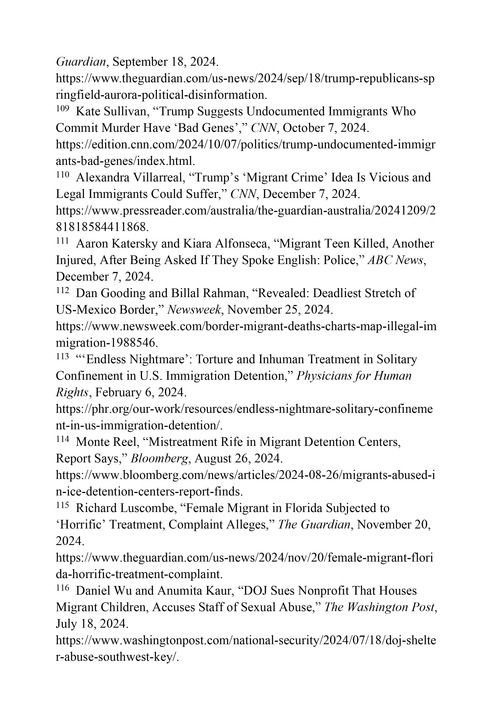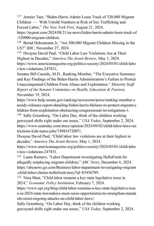 数十万移民儿童下落不明。移民儿童入境美国后,被迫与家庭分开拘留,在被释放后失联,等待他们的是被剥削、虐待、强迫劳动甚至面临生命危险。英国广播公司网站2024年11月27日报道,由于政府将入境的无陪伴移民儿童释放给“未经妥善审查”的美国境内的成年担保人,2018年至2023年9月,共有超过32万名无父母陪伴的移民儿童在美国失去行踪。117其中许多儿童可能被诱骗从事强迫劳动和性交易,处于被虐待、剥削和贩运的境地。118