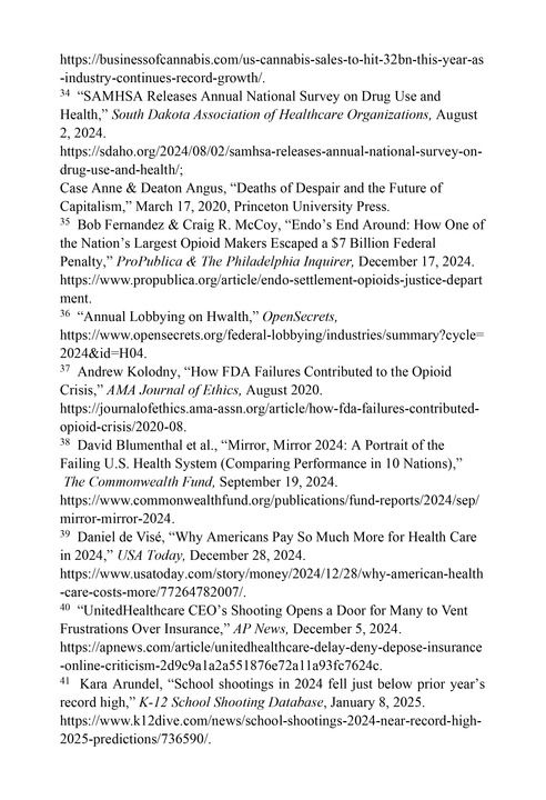 政商共谋导致药物滥用和毒品危机。美国缉毒署署长安妮·米尔格拉姆(Anne Milgram)认为,“美国面临有史以来最危险和最致命的毒品危机。”31过去几年,美国合成阿片类药物(例如芬太尼)和兴奋剂(例如可卡因和甲基苯丙胺)的过量用药情况持续上升。2023年美国发生105007例药物过量死亡,其中35岁至44岁成年人的药物过量死亡率最高。32美国大麻行业已成为全国性行业,2024年零售销售额超过320亿美元。33《2023年美国药物使用和健康调查报告》显示,当年约有6180万12岁以上的美国人使用大麻;近900万美国人滥用阿片类药物,“阿片类药物已成为美国大众的麻醉剂”。34美国制药巨头们为牟利欺骗性地推广阿片类药物的使用,并且千方百计逃避索赔追责。35美国医药利益集团还加大政策游说力度,2007年以来每年游说投入都超过2亿美元,2023年更是达到创纪录的近4亿美元。36美国食品药品监督管理局(Food and Drug Administration, FDA)在批准和标示新镇痛药时,履职不力监管失败。37利益绑架、政商共谋、监管失职是美国药物滥用和毒品危机的祸乱之源。