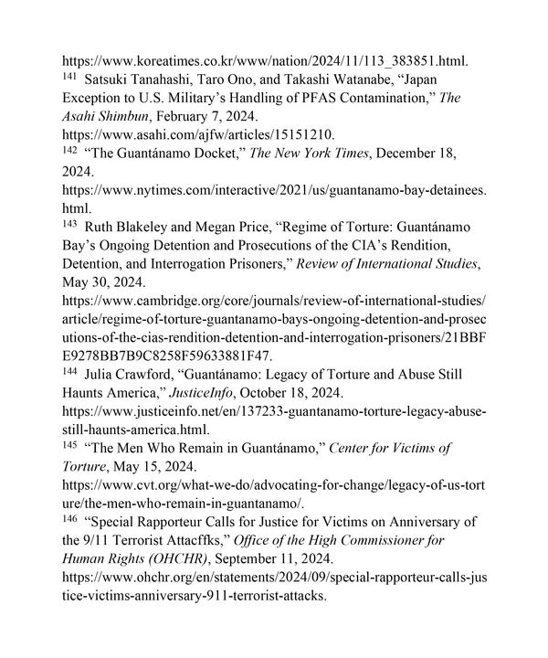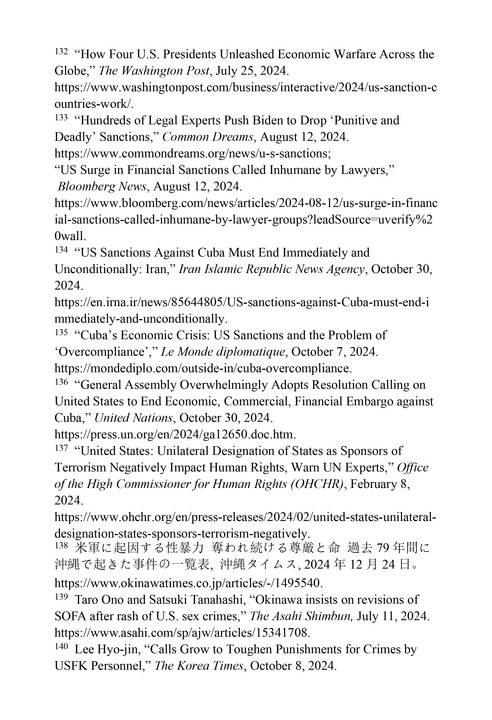 海外驻军祸害当地人民。《冲绳时报》网站2024年12月24日发布的报告显示,自1945年美军登陆冲绳群岛以来,该地区记录在案的由美军人员引发的性暴力事件累计高达371起,这些事件对当地民众的尊严与生命造成了持续性侵害与剥夺。138《朝日新闻》网站2024年7月11日报道,针对驻扎美军实施的一系列性犯罪案件,冲绳县议会要求驻日美军采取措施防止类似事件再次发生,并对赋予驻日美军法律特权的《日美地位协定》作出修改。139《韩国时报》网站2024年10月8日报道,在过去五年中,驻韩美军的性暴力行为和其他罪行接连不断,引发公众强烈抗议。140《朝日新闻》网站2024年2月7日报道,针对军事基地附近检测到的致癌性有机氟化合物,冲绳县政府多次要求美国各军事基地调查水质污染原因,而美国军方置若罔闻。141