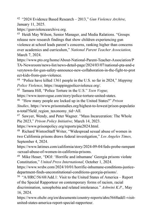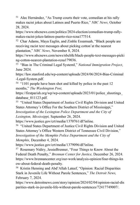 系统性种族歧视笼罩执法司法体系。美国律师协会和斯坦福大学2024年6月发布的报告《刑事法律系统中的偏见》指出,美国的种族偏见存在于逮捕、保释、指控、判刑等刑事程序的各个阶段。与违法情节相似的白人相比,非洲裔和拉美裔更容易被警察逮捕,受到更多的审前拘留和更严厉的刑罚。在涉及轻微的交通、毒品和财产犯罪时,种族差别对待尤为明显。53种族歧视更突出体现在警察暴力执法中。在有记录的美国警察暴力致死事件中,非洲裔的遇害率是白人的3倍,印第安原住民的遇害率是白人的2.2倍,拉美裔的遇害率是白人的1.3倍。54美国司法部调查报告指出,密西西比州列克星敦警察局“建立了一个可以让警察肆意违法的体系”,这个约76%居民是非洲裔的乡村小镇,存在着令人震惊的种族歧视性执法和骚扰现象。55美国司法部的调查报告发现,田纳西州孟菲斯市警察局过度使用武力,歧视性对待非洲裔美国人,特别体现在儿童身上。2018年1月至2023年8月,该地因违反宵禁或游荡规定而被捕的非洲裔儿童有180名,而白人儿童只有4名;因扰乱治安而被捕的非洲裔儿童有120名,而白人儿童只有1名。56布伦南司法中心网站2024年12月10日报道,美国联邦司法机构针对某些联邦罪行所作的判决,在死刑的适用上存在种族差异。在得克萨斯州,联邦审判中非洲裔被判处死刑的可能性是其他族裔的16倍。57《底特律新闻》(Detroit News)网站2024年2月4日报道,非洲裔约占美国总人口的13%,但在所有被判处终身不得假释的儿童中,61%是非洲裔。58