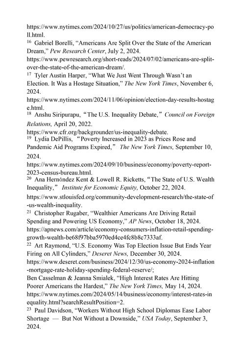 民众对美式民主失望至极。根据《纽约时报》和锡耶纳学院2024年10月28日的调查数据,几乎一半的选民对美国政治体制的成效表示怀疑,62%的受访者认为美国政府主要为精英阶层而非普通民众服务。15皮尤研究中心(Pew Research Center)的数据显示,41%的美国人曾经相信的“美国梦”已经破灭,60%的18至29岁年轻人认为“美国梦”已无法实现甚至从未实现过。16美国贝茨学院学者泰勒·哈勃(Tyler Austin Harper)2024年11月6日发表文章称,“美国政治体系已经从根本上崩溃了”,两党代表着特殊利益集团的利益,“甚至毫不掩饰对选民需求的漠视”。绝大多数选民认为美国正走在错误的道路上;近80%的人表示,大选并没有让他们为美国感到骄傲。17