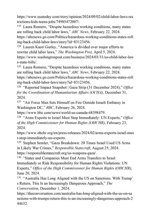 非法雇佣移民童工数量暴增。美国参议院2024年11月9日发布的报告称,移民儿童中非法童工数量以令人震惊的速度增加,达到20世纪初以来的最高水平。119根据美国劳工部的数据,2015年至2023年,美国有记录的违法使用童工行为(不包括未报告行为)涉及的儿童数量激增了472%。120其中相当一部分是移民儿童。仅根据美国劳工部披露的数据,2024财年各行业就有4030名儿童被违法雇佣。在该部门提起的736起诉讼中,近一半涉及违反危险职业法雇佣儿童。美国广播公司网站2024年12月7日报道,移民儿童在美国不仅从事农业和食品供应工作,还从事建筑和修理屋顶等危险工作。121面对童工激增的局面,当局的应对措施却是修改童工立法,放宽限制使非法行为“合法化”,为剥削儿童大开方便之门。122根据经济政策研究所(Economic Policy Institute)的数据,自2021年以来,至少有30个州提出或通过了削弱童工保护的法案,其中9个州通过了扩大儿童在危险职业或工作场所就业的法案。仅2024年,就有11个州提出或采取了新的法案取消童工保护。123《华盛顿邮报》网站报道,印第安纳州的新法律延长了14岁和15岁儿童的合法工作时长,废除了对16岁及17岁儿童的所有工作时间限制。佛罗里达州的法律允许16岁和17岁的儿童连续工作超过7天,取消对所有就读于在线或家庭学校的儿童的工作时长限制,允许他们通宵工作。艾奥瓦州的立法则允许该州的儿童从事一些过去被认为过于危险的工作。124这些法律非但没有为儿童权益提供保护,反而成为“剥削儿童”的工具。对此,纽约大学学者特里·格斯坦(Terri Gerstein)批评称,“削弱对童工保护的法律是不道德的、彻头彻尾错误的决定。弱化和倒退的童工法导致更多的孩子在工作中肢体伤残,甚至丧生。”125