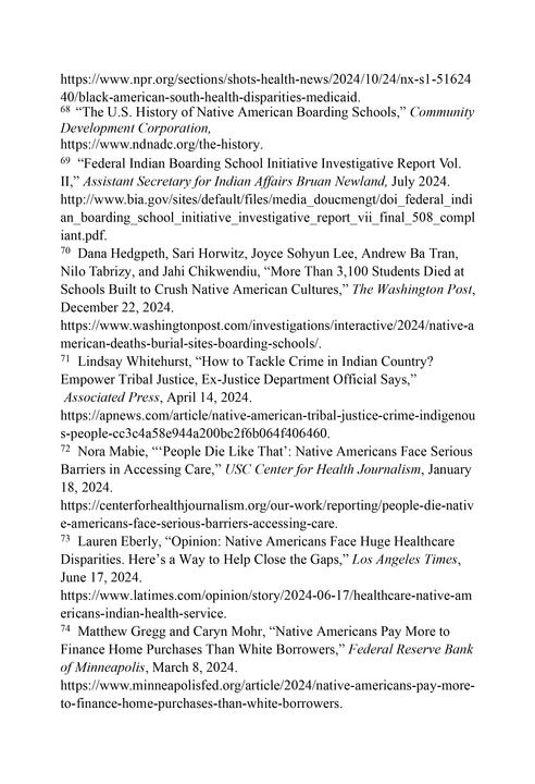 印第安原住民权利惨遭践踏。美联社(Associated Press)网站2024年4月14日报道,印第安原住民遭受暴力犯罪、妇女被强奸或被性侵犯的可能性是其他族群的2倍。71南加州大学健康新闻中心(USC Center for Health Journalism)2024年1月18日指出,原住民在获得医疗服务上面临严重障碍。蒙大拿州印第安原住民的平均寿命比该州的白人短17年。72《洛杉矶时报》网站2024年6月17日报道,印第安原住民是美国所有种族中死亡率最高、预期寿命最低的族群,而这些差异并非来自遗传。73明尼阿波利斯联邦储备银行官网2024年3月8日发文称,印第安原住民在贷款购房时支付的利率高于白人借款人。保留地内印第安人的贷款利率平均比白人借款人高1.43个百分点。74印第安人权利基金会(Native American Rights Fund)网站2024年8月13日发文指出,印第安原住民在选举中参与率低。大约四分之一符合资格的印第安原住民未登记投票,比白人选民投票率低约16个百分点,这源于印第安原住民长期遭受排斥的历史。75