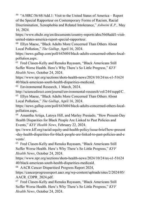 环境种族主义贻害无穷。联合国人权专家2024年5月16日发布的报告指出,在美国“那些面临着系统性不平等和种族主义状况的群体承受着气候和生态危机带来的不成比例的恶劣影响”。59美国疾病控制与预防中心(Centers for Disease Control and Prevention)和美国肺脏协会等组织认为,不同种族生活环境的污染及其危害程度存在显著差异,这是导致众多健康状况差异的根本原因。由于种族隔离和“红线政策”等历史原因,非洲裔更有可能暴露在有害或污染的环境中。60凯泽家庭基金会(Kaiser Family Foundation, KFF)2024年10月24日报道,美国近80%的城市固体废物焚烧炉建造在非洲裔、拉美裔和低收入社区,这可能导致癌症等一系列恶性疾病高发。61《环境研究》(Environmental Research)2024年3月刊登的美国杜兰大学、孟菲斯大学、路易斯安那州立大学3位学者联合署名的一项研究结果指出,路易斯安那州“癌症带”(Cancer Alley)区域化学工厂密集,那里的人口以非洲裔为主,当地居民因工业空气污染罹患癌症的风险高居美国之首,是全国平均值的7倍多,空气污染对当地孕产妇和新生儿健康的损害高达全国平均值的3倍。62盖洛普公司(The Gullup)的调查结果显示,环境污染正在使大量美国非洲裔流离失所。仅在2023年5月至2024年4月的12个月内,大约400万非洲裔因污染不得不暂时搬迁,另有200万人不得不永久搬迁。63