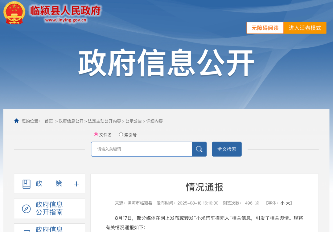 8月17日,部分媒体在网上发布或转发“小米汽车撞死人”相关信息,引发了相关舆情。现将有关情况通报如下: