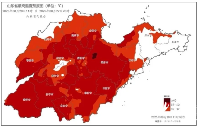 山东省气象台于8月20日11时00分升级高温黄色预警为高温橙色预警:18—19日,鲁西北、鲁中和鲁南地区已出现35℃以上的高温天气,局部地区达40℃。预计20—22日最高气温,聊城、济南、淄博、潍坊、菏泽、济宁、枣庄、临沂和日照37~39℃,局部可达40℃,沿海地区30~34℃,其他地区35~36℃,局部可达38℃。