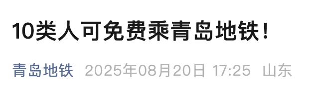 “青岛地铁”微信公众号今天发布消息:10类人可免费乘青岛地铁!