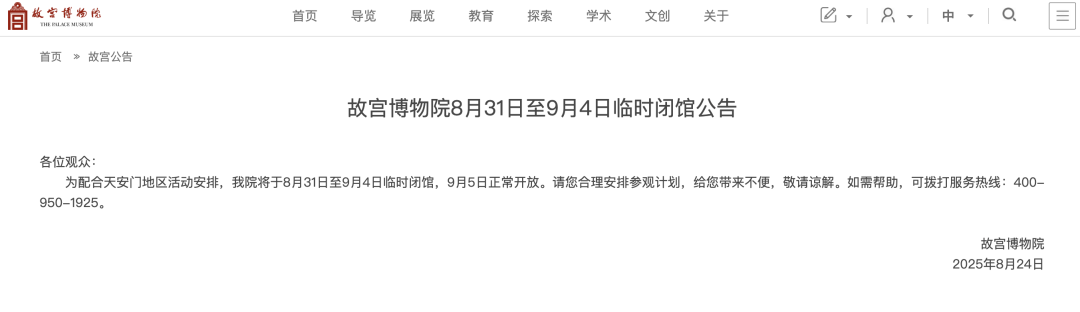 周知:故宫博物院8月31日至9月4日临时闭馆 2025-08-24 19:38 故宫博物院官方网站 0 据故宫博物院8月24日消息,为配合天安门地区活动安排,我院将于8月31日至9月4日临时闭馆,9月5日正常开放。请您合理安排参观计划,给您带来不便,敬请谅解。如需帮助,可拨打服务热线:400-950-1925。 责任编辑:王凤一