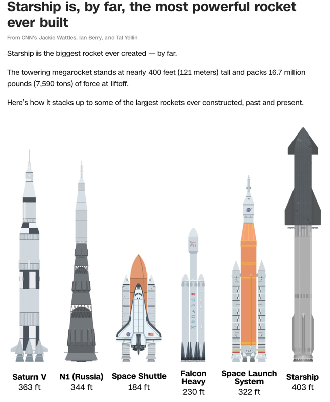 △美国有线电视新闻网(CNN)报道,“星舰”高度达到121米,升空时推力达到7590吨,是迄今人类建造的最强大火箭。