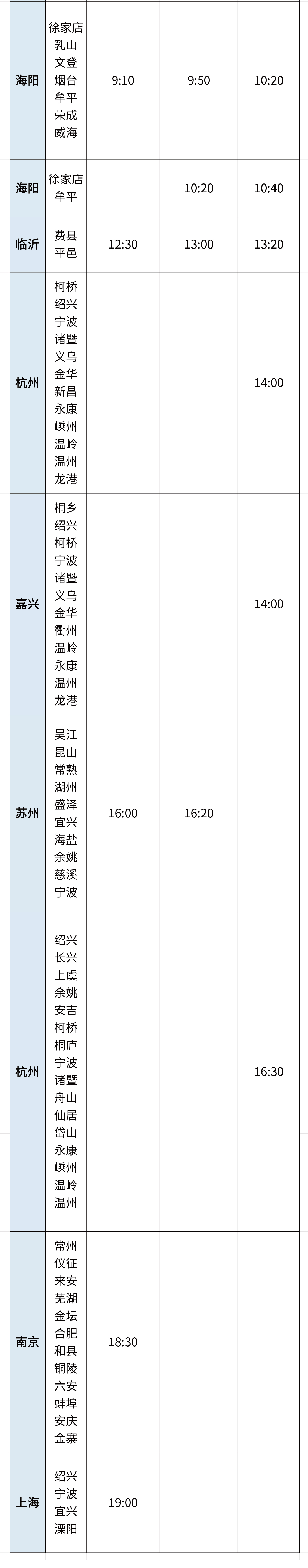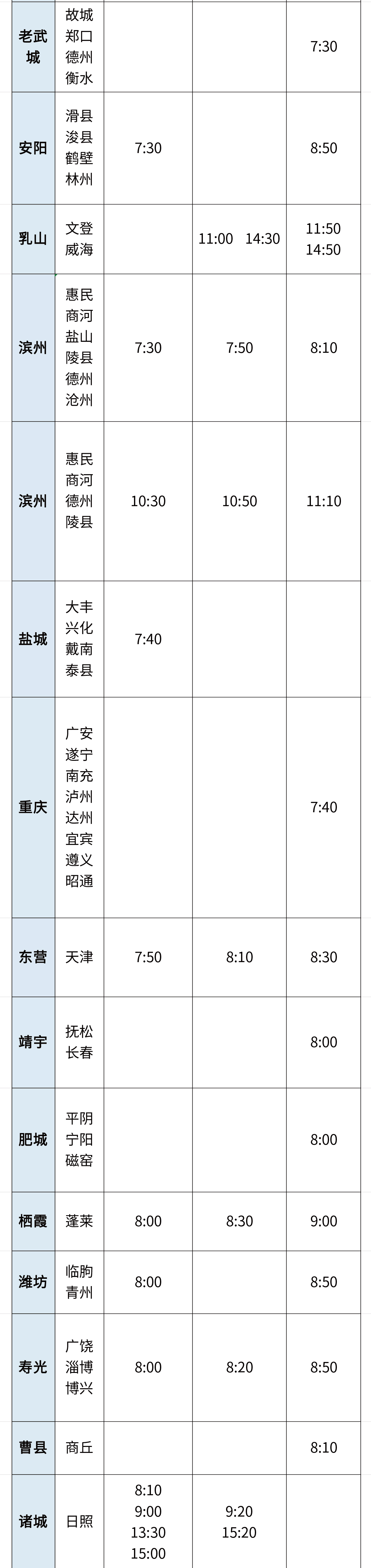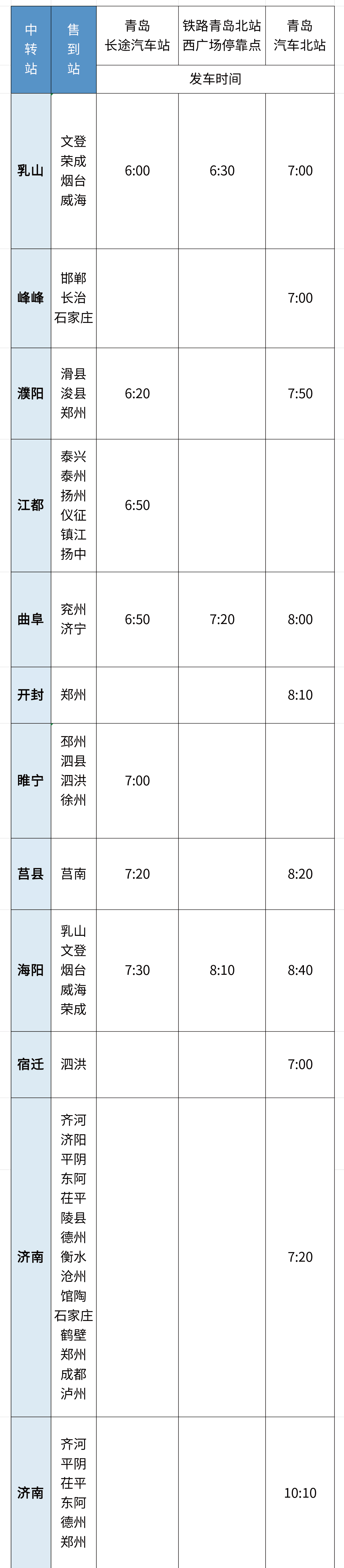 青岛日报社/观海新闻8月27日讯 8月末,正值暑期返程高峰,青岛城运控股交运汽车总站“联程联运”站点再次更新,新增诸城中转日照,寿光中转博兴、淄博,滨州中转惠民、盐山、沧州六个站点。目前,已累计开通“联程联运”线路78条。具体班次如下表(发车时间请以当日实际情况为准):