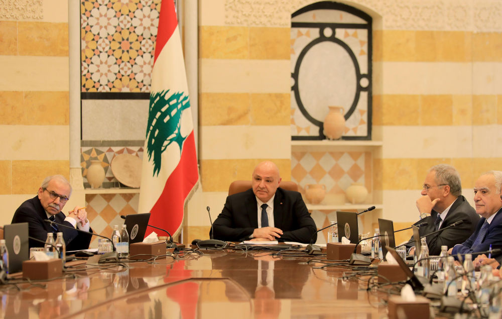8月5日,黎巴嫩总统约瑟夫·奥恩(左二)和总理纳瓦夫·萨拉姆(左一)在贝鲁特的总统府巴卜达宫出席内阁会议。新华社发(比拉尔·贾维希摄)
