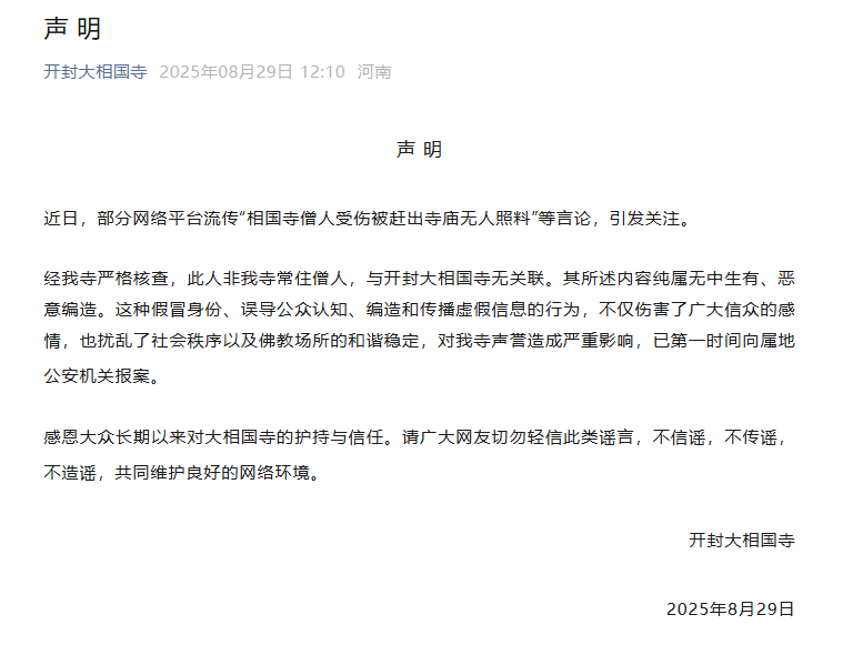 经我寺严格核查,此人非我寺常住僧人,与开封大相国寺无关联。其所述内容纯属无中生有、恶意编造。这种假冒身份、误导公众认知、编造和传播虚假信息的行为,不仅伤害了广大信众的感情,也扰乱了社会秩序以及佛教场所的和谐稳定,对我寺声誉造成严重影响,已第一时间向属地公安机关报案。