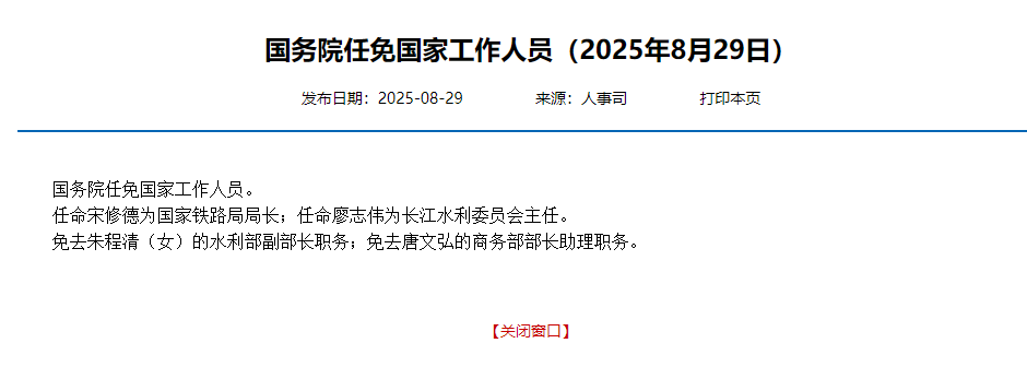 宋修德任国家铁路局局长,廖志伟任长江水利委员会主任 2025-08-29 16:24 人社部网站 0 国务院任免国家工作人员。 任命宋修德为国家铁路局局长;任命廖志伟为长江水利委员会主任。 免去朱程清(女)的水利部副部长职务;免去唐文弘的商务部部长助理职务。 责任编辑:程雪涵