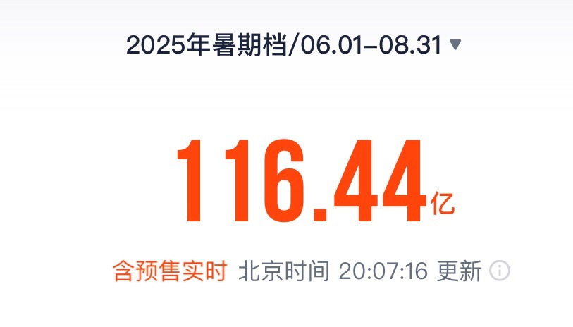 截至今天(8月29日)20:07,2025年暑期档电影总票房达到116.44亿,超过2024年暑期档电影总票房。