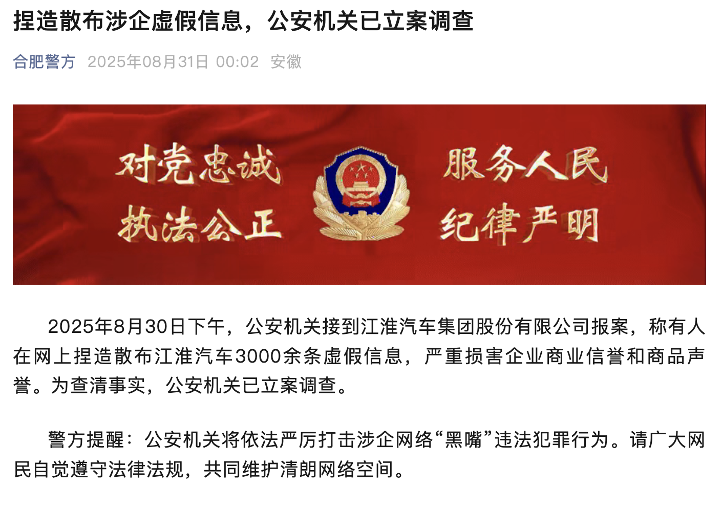 2025年8月30日下午,公安机关接到江淮汽车集团股份有限公司报案,称有人在网上捏造散布江淮汽车3000余条虚假信息,严重损害企业商业信誉和商品声誉。为查清事实,公安机关已立案调查。