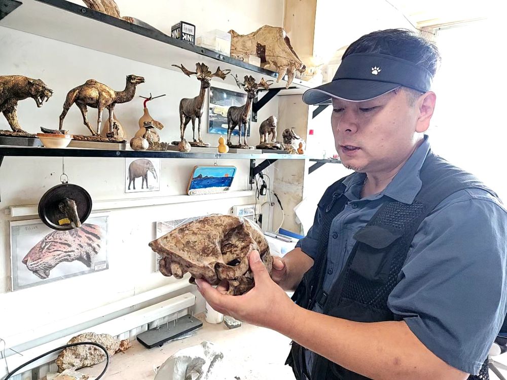 新华社沈阳8月31日电(记者于也童、张博群)走进位于大连市金普新区复州湾街道的一处工作室,一副高3.4米、宽1.5米、长4.5米的金普巨副骆驼骨架标本引人注目。身高1.76米的记者在它身下抬起头,只能看到这只巨兽的下颌骨。庞大的体型、微黄的骨骼,让它看起来与工作室内的现代文明有些“格格不入”。