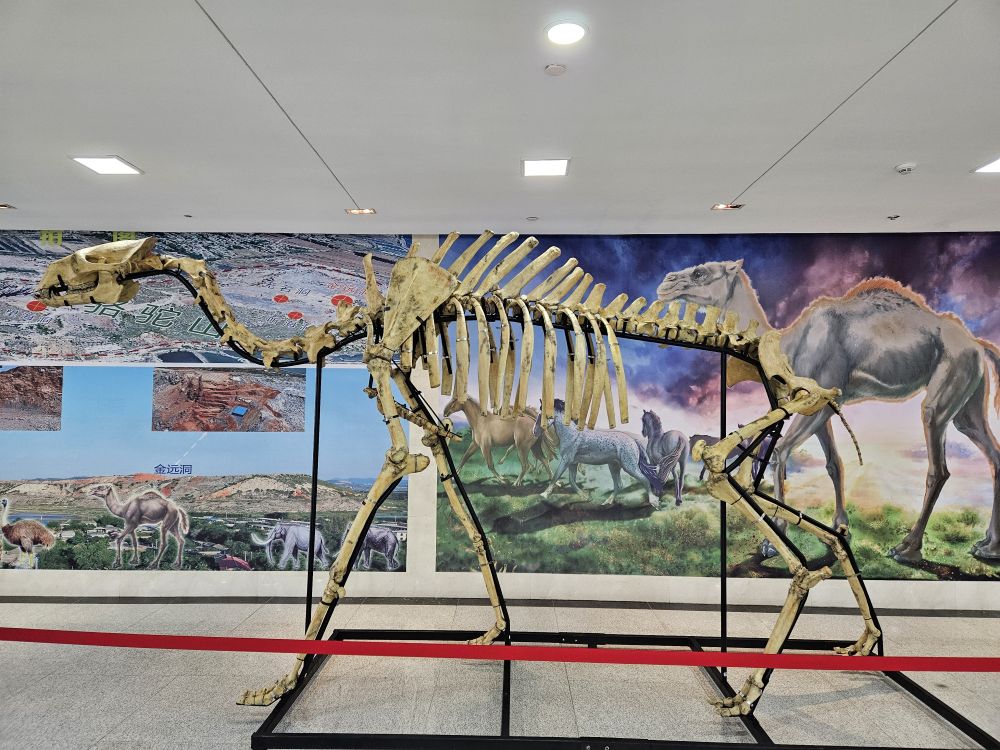 图为复原的金普巨副骆驼骨架,这副骨架被陈列在大连普湾经济区管委会。新华社记者 于也童 摄