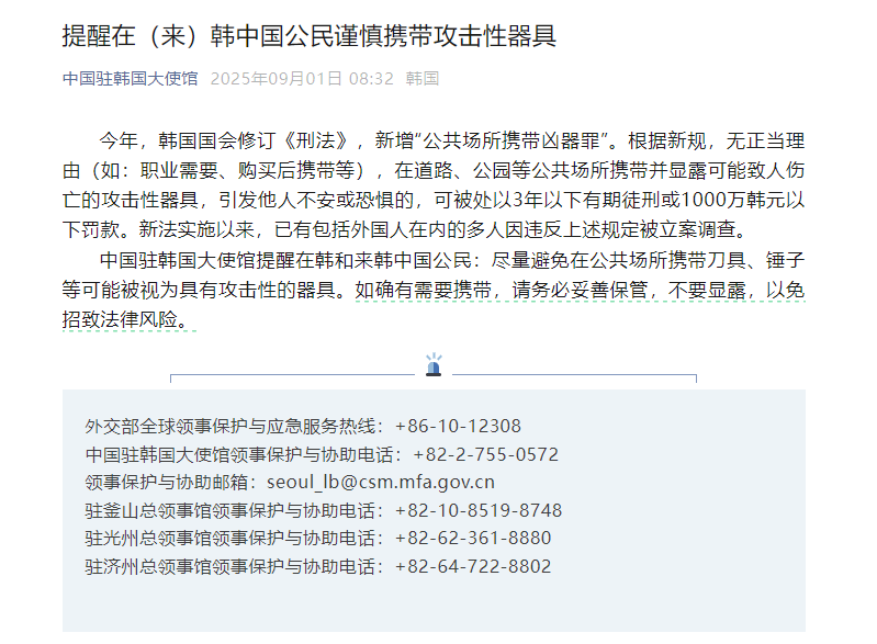 9月1日,中国驻韩国大使馆发布提醒在(来)韩中国公民谨慎携带攻击型器具的安全提示。全文如下: