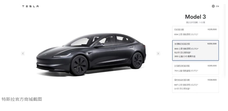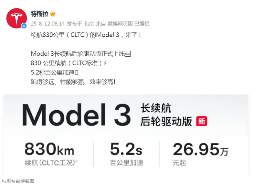 特斯拉Model 3长续航后轮驱动版车型于8月12日正式发布,是特斯拉当前续航最强的车型,CLTC续航可达830公里,售价26.95万元起。该车型百公里加速时间5.2秒,比后轮驱动版动力更强(6.1秒)。