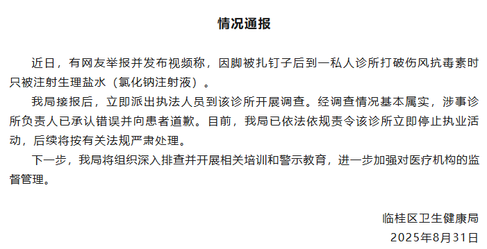 8月31日,广西壮族自治区桂林市临桂区卫生健康局发布通报称:近日,有网友举报并发布视频称,因脚被扎钉子后到一私人诊所打破伤风抗毒素时只被注射生理盐水(氯化钠注射液)。