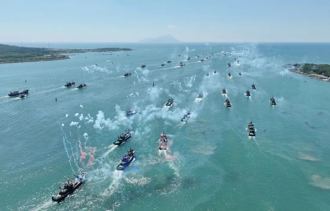 从空中俯瞰,海上急行的渔船星罗棋布、浩浩荡荡。