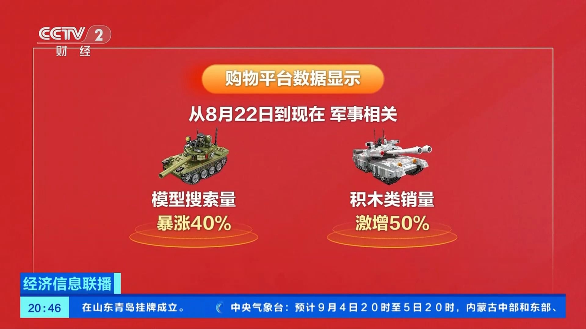 阅兵带来的远不止这些,打开购物网站,辽宁舰、歼-20模型广受热捧。购物平台数据显示,从8月22日到现在,军事模型搜索量暴涨40%,积木类销量激增50%。