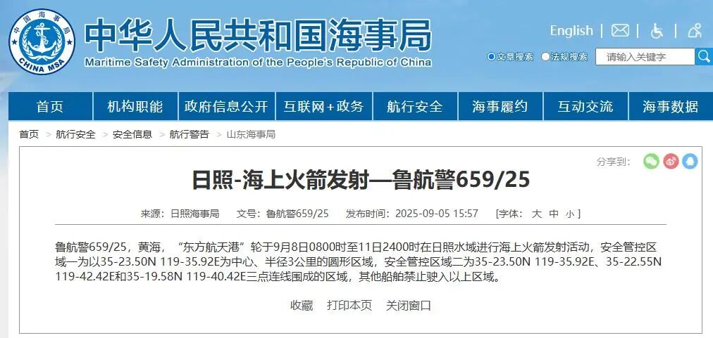 鲁航警659/25,黄海,“东方航天港”轮于9月8日0800时至11日2400时在日照水域进行海上火箭发射活动,安全管控区域一为以35-23.50N 119-35.92E为中心、半径3公里的圆形区域,安全管控区域二为35-23.50N 119-35.92E、35-22.55N 119-42.42E和35-19.58N 119-40.42E三点连线围成的区域,其他船舶禁止驶入以上区域。