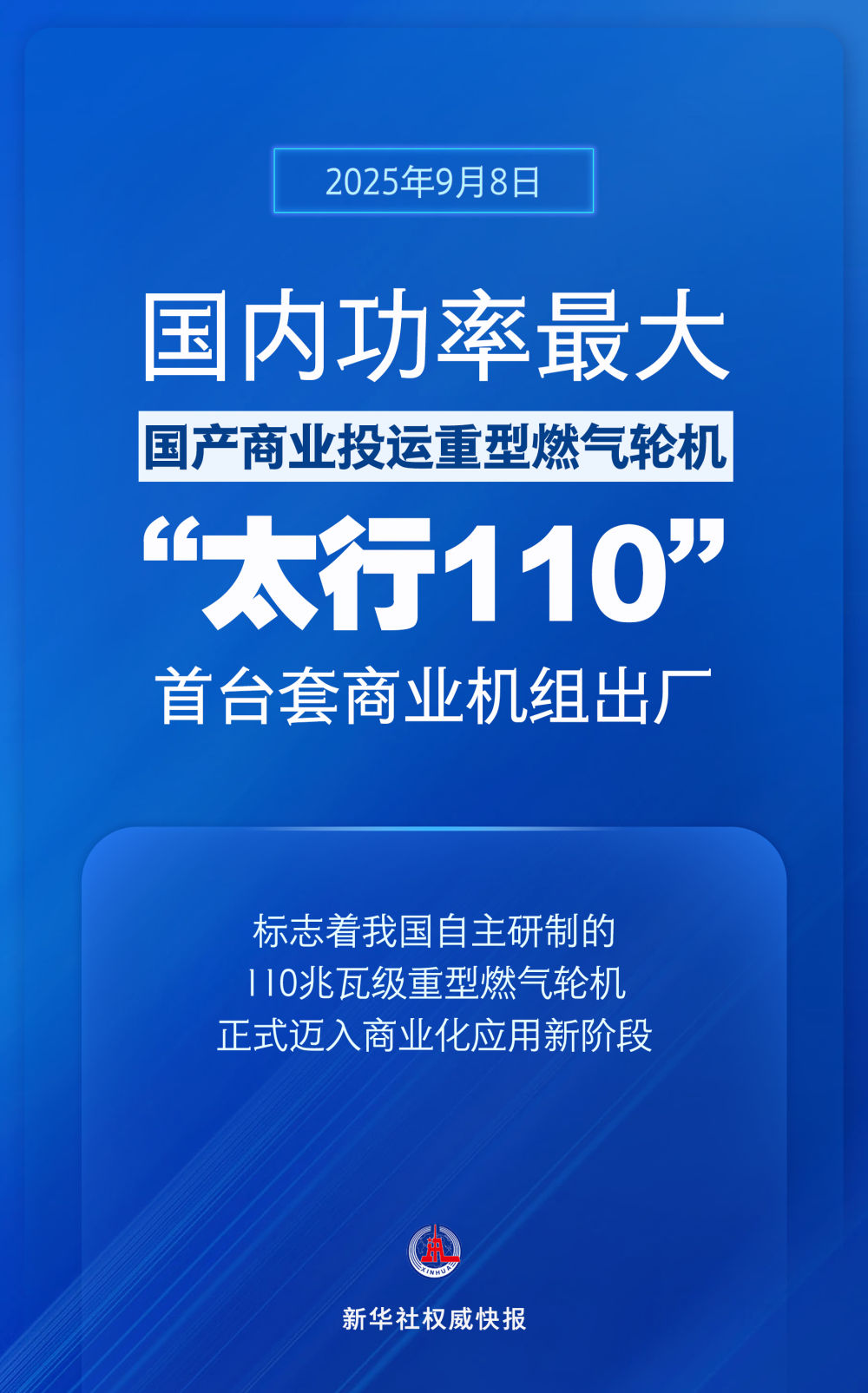 记者从中国航空发动机集团有限公司获悉,9月8日,国内功率最大的国产商业投运重型燃气轮机“太行110”首台套商业机组在中国航发燃机制造装试基地出厂,即将交付。这标志着我国自主研制的110兆瓦级重型燃气轮机正式迈入商业化应用新阶段。