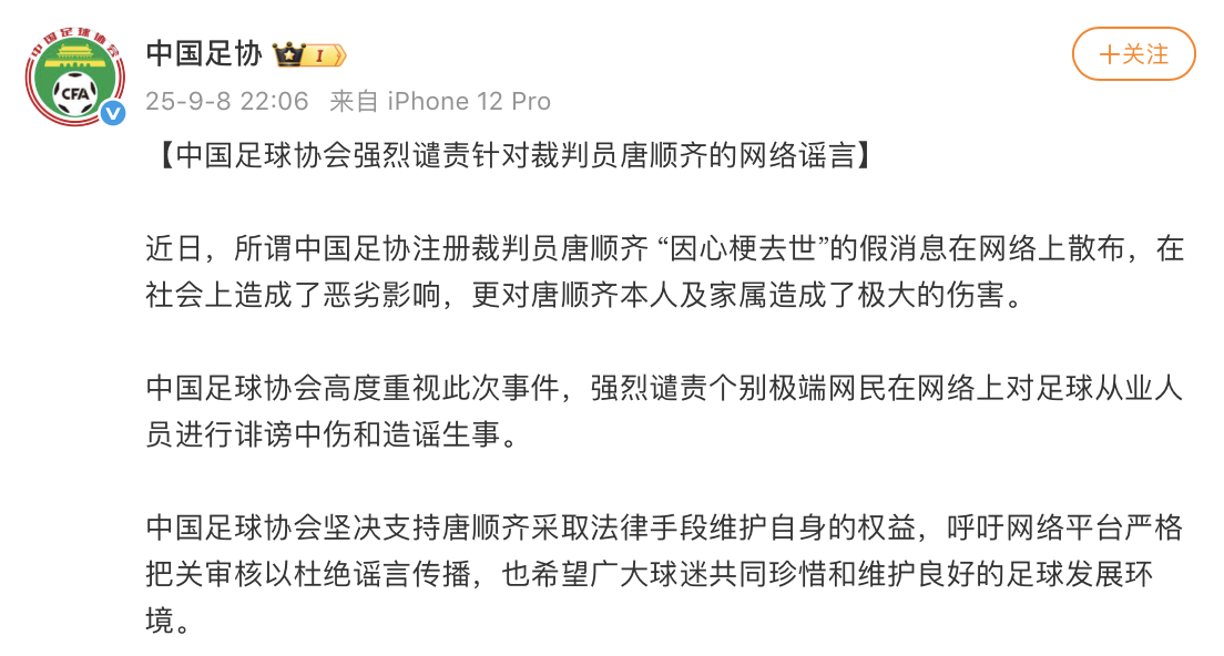 近日,所谓中国足协注册裁判员唐顺齐“因心梗去世”的假消息在网络上散布,在社会上造成了恶劣影响,更对唐顺齐本人及家属造成了极大的伤害。