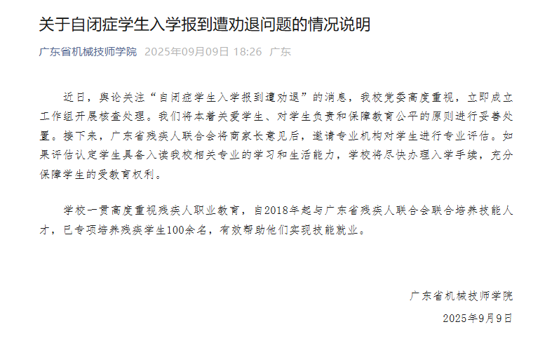 近日,舆论关注“自闭症学生入学报到遭劝退”的消息,我校党委高度重视,立即成立工作组开展核查处理。我们将本着关爱学生、对学生负责和保障教育公平的原则进行妥善处置。接下来,广东省残疾人联合会将商家长意见后,邀请专业机构对学生进行专业评估。如果评估认定学生具备入读我校相关专业的学习和生活能力,学校将尽快办理入学手续,充分保障学生的受教育权利。