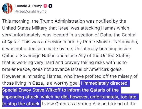 9日,美国总统特朗普在其社交平台“真实社交”发文称,当天上午,政府接到美军通知,以色列正在对位于多哈某区域的哈马斯目标实施袭击。特朗普称,袭击是以总理内塔尼亚胡单方面的决定,而不是他的决定。特朗普称,他当时“立即指示特使威特科夫向卡塔尔通报即将发生的袭击”。袭击发生后,他与卡塔尔埃米尔(国家元首)及首相通话,保证此类事件不会在其领土重演。他还已指示国务卿鲁比奥尽快完成与卡塔尔的防务合作协议。