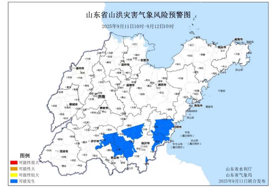 青岛日报社/观海新闻9月11日讯 山东省水利厅和山东省气象局9月11日联合发布山东省山洪灾害气象预警:预计9月11日10时至9月12日10时,青岛、枣庄、济宁、日照、临沂等市局部地区可能发生山洪灾害(蓝色预警)。