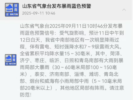 山东省气象台2025年09月11日10时46分发布暴雨蓝色预警信号:受气旋影响,预计11日中午到12日白天,我省中南部地区有一次明显降雨过程,伴有雷电、短时强降水和7~9级雷雨大风。全省累积平均降水量15~30毫米,其中,菏泽、济宁、枣庄、临沂、日照和青岛南部有大雨到暴雨局部大暴雨(30~60毫米局部100~150毫米),泰安、济南南部、淄博、潍坊、青岛北部、烟台和威海有小雨局部中雨(5~10毫米局部20毫米以上),其他地区局部有阵雨。请注意防范!