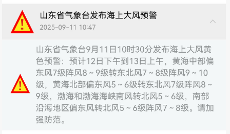 山东省气象台9月11日10时30分发布海上大风黄色预警:预计12日下午到13日上午,黄海中部偏东风7级阵风8~9级转东北风7~8级阵风9~10级,黄海北部偏东风5~6级转东北风7级阵风8~9级,渤海和渤海海峡南风转北风5~6级,南部沿海地区偏东风转北风5~6级阵风7~8级。请加强防范。(山东天气)