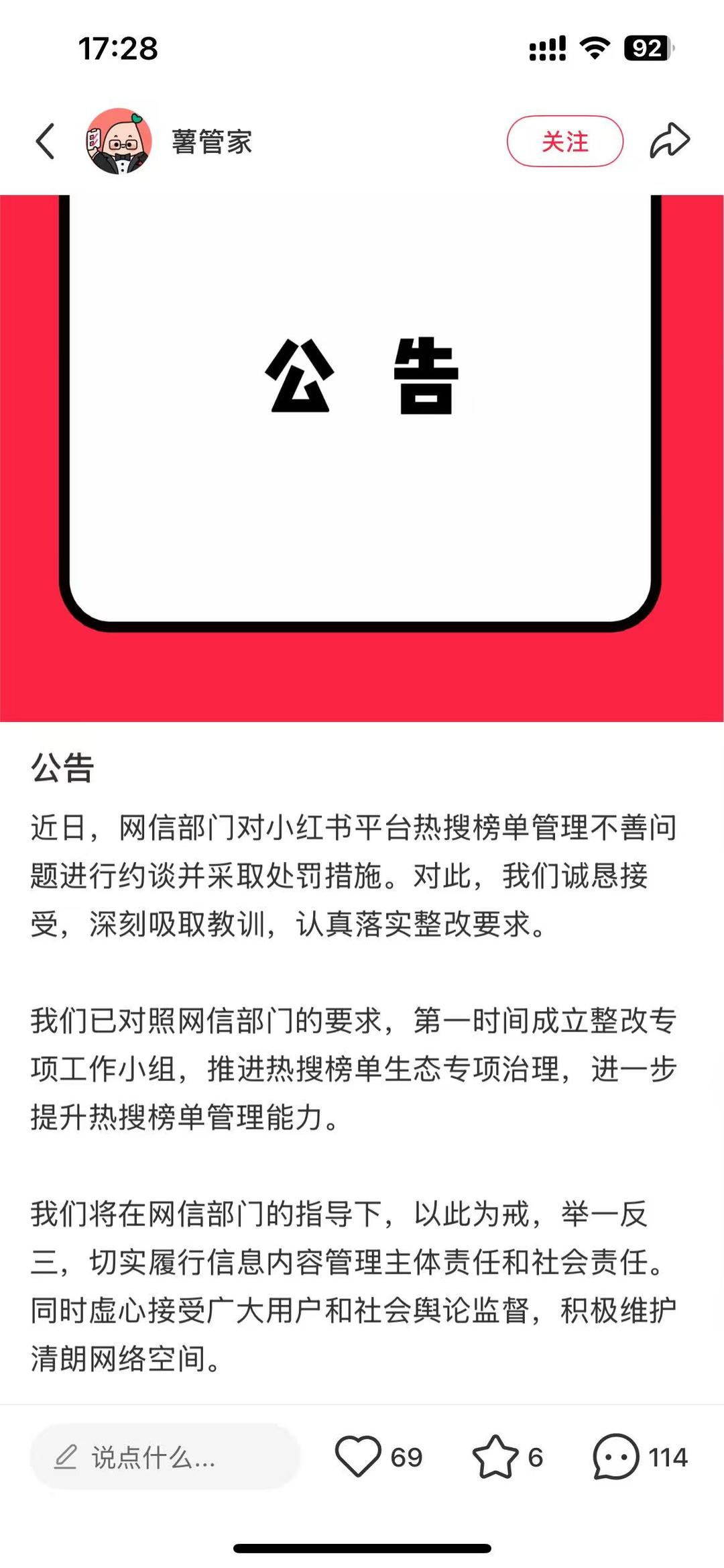 近日,网信部门对小红书平台热搜榜单管理不善问题进行约谈并采取处罚措施。对此,我们诚恳接受,深刻吸取教训,认真落实整改要求。