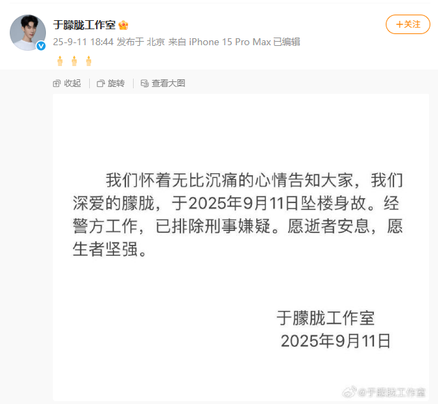 刚刚,于朦胧工作室官方微博发文:演员于朦胧于2025年9月11日坠楼身故。经警方工作,已排除刑事嫌疑。