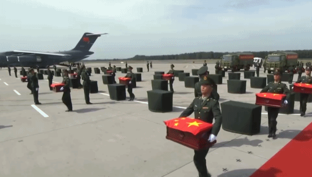 12日上午,韩方将志愿军烈士遗骸棺椁运送至仁川国际机场并移交给中方。