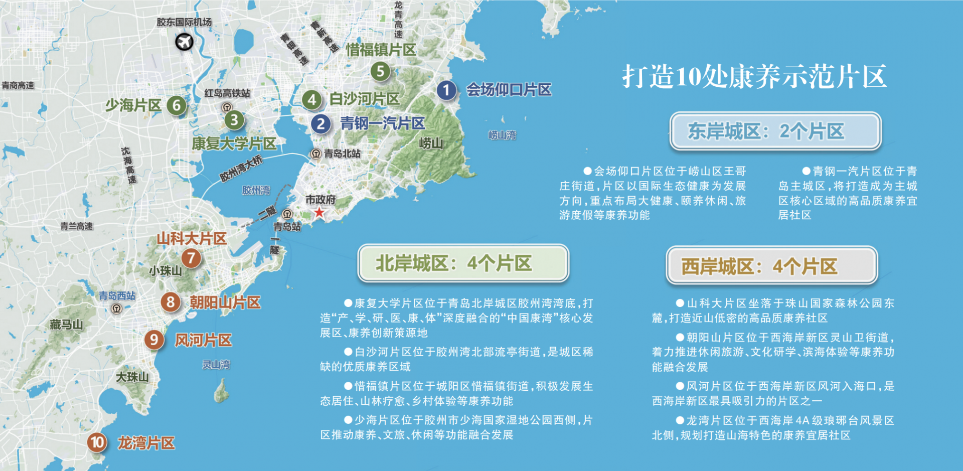 突出“全域康养、全龄健康”的“中国康湾”特质,青岛将“打造健康居住新生态”列为“中国康湾”建设三年行动的首要任务,科学规划城市康养空间,布局大型健康社区项目,提出打造集“多代同堂、医食住行、颐乐学为、怡康养护”于一体的综合健康全龄社区,吸引国内知名地产、康养企业投资布局。