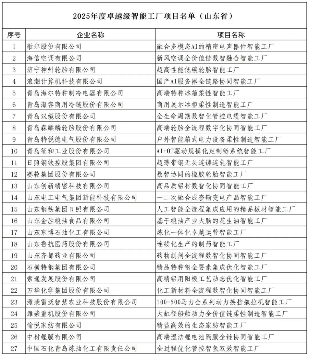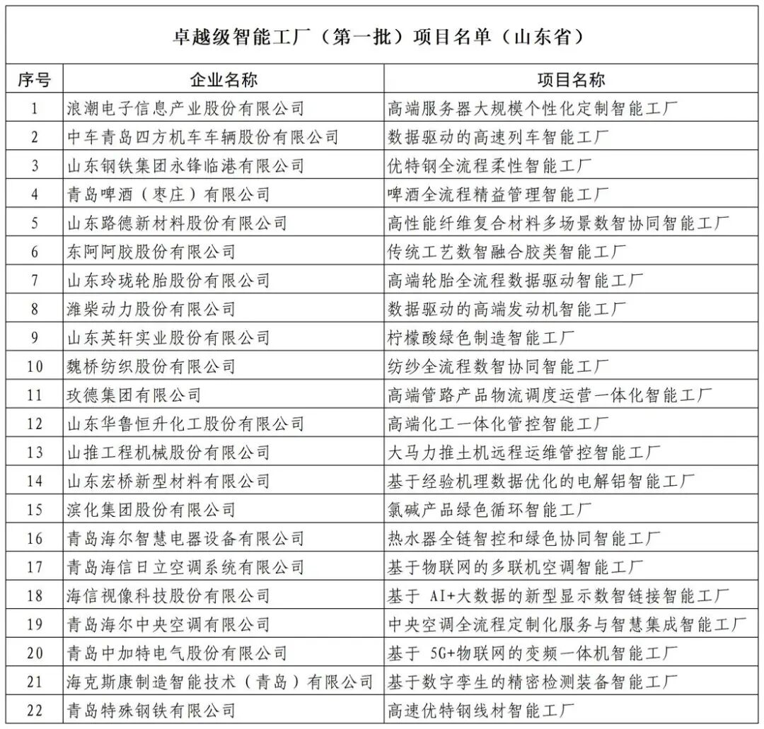 2025年1月,工信部发布了卓越级智能工厂(第一批)项目公示,共计235家,山东22家入选。近日,2025年度卓越级智能工厂项目名单公示,共有274家,山东27家入选。