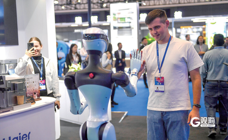 一名参会外国嘉宾与人形机器人互动。赵健鹏 摄