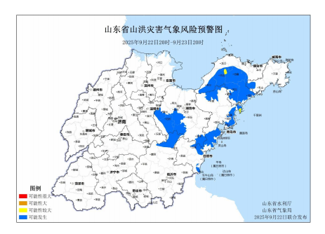 青岛日报社/观海新闻9月22日讯 山东省水利厅和山东省气象局9月22日联合发布山东省山洪灾害气象预警: 预计9月22日20时至9月23日20时,青岛、烟台等市局部地区发生山洪灾害的可能性较大(黄色预警),青岛、烟台、潍坊、威海、日照、临沂等市局部地区可能发生山洪灾害(蓝色预警)。