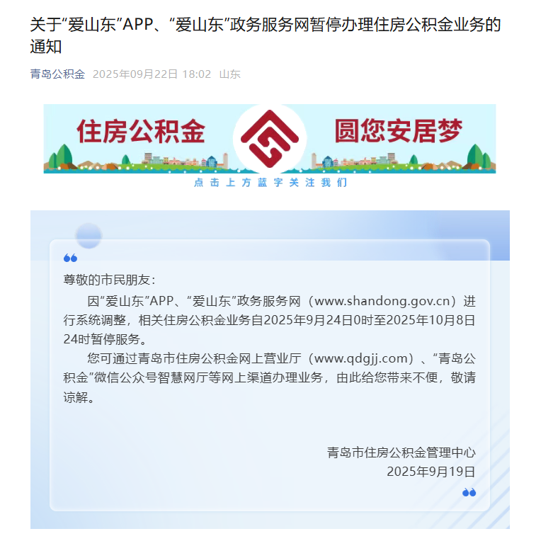 因“爱山东”App、“爱山东”政务服务网(www.shandong.gov.cn)进行系统调整,相关住房公积金业务自2025年9月24日0时至2025年10月8日24时暂停服务。