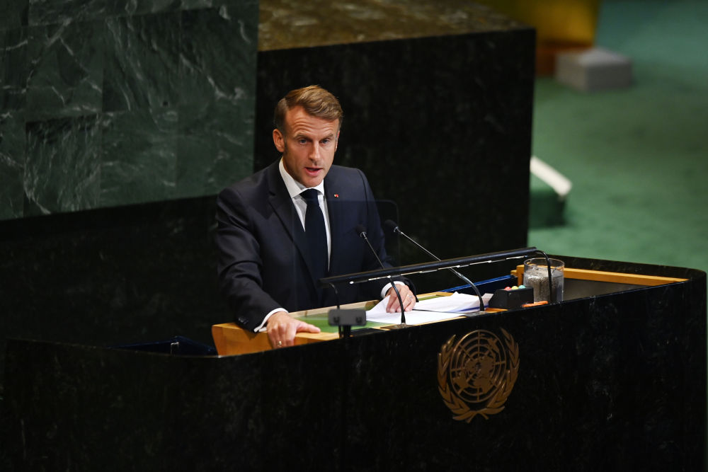 9月22日,在位于纽约的联合国总部,法国总统马克龙在和平解决巴勒斯坦问题和落实“两国方案”高级别国际会议上讲话。新华社记者 李睿 摄
