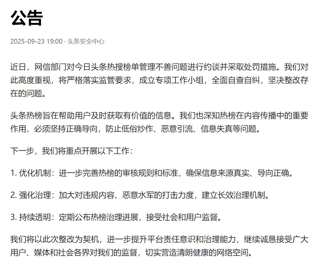 近日,网信部门对今日头条热搜榜单管理不善问题进行约谈并采取处罚措施。我们对此高度重视,将严格落实监管要求,成立专项工作小组,全面自查自纠,坚决整改存在的问题。