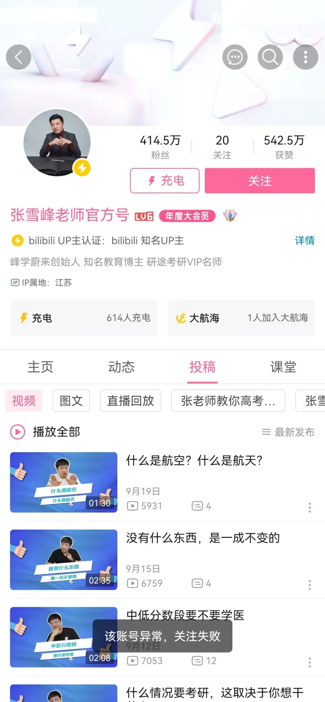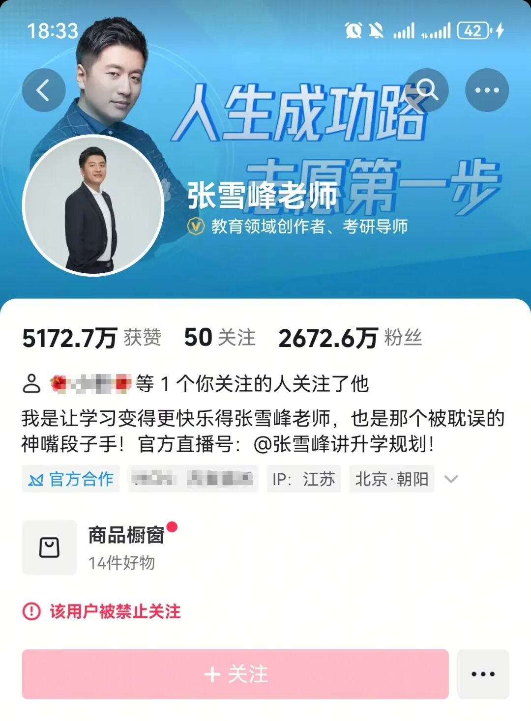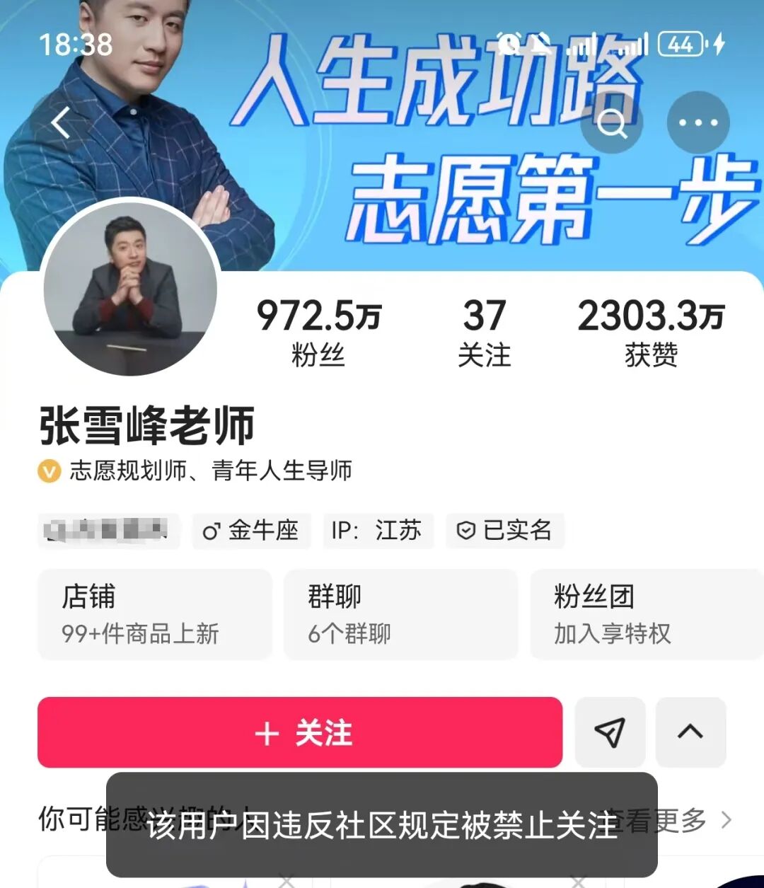 9月24日下午,话题“张雪峰多个平台账号被禁止关注”冲上热搜。