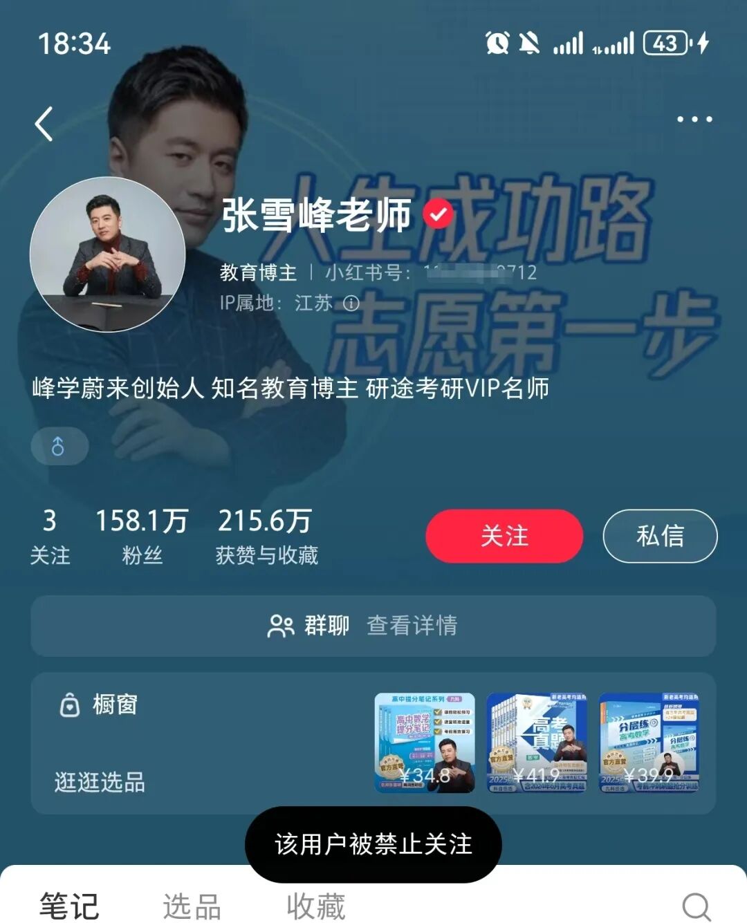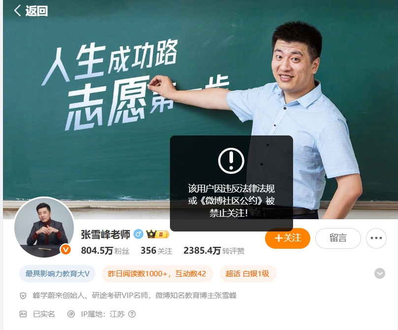 据悉,@张雪峰老师 的微博、抖音、小红书、快手等多个平台的认证账号被限制关注。其中,微博平台提示“该用户因违反法律法规或《微博社区公约》被禁止关注”,快手平台则提示“该用户因违反社区规定被禁止关注”。
