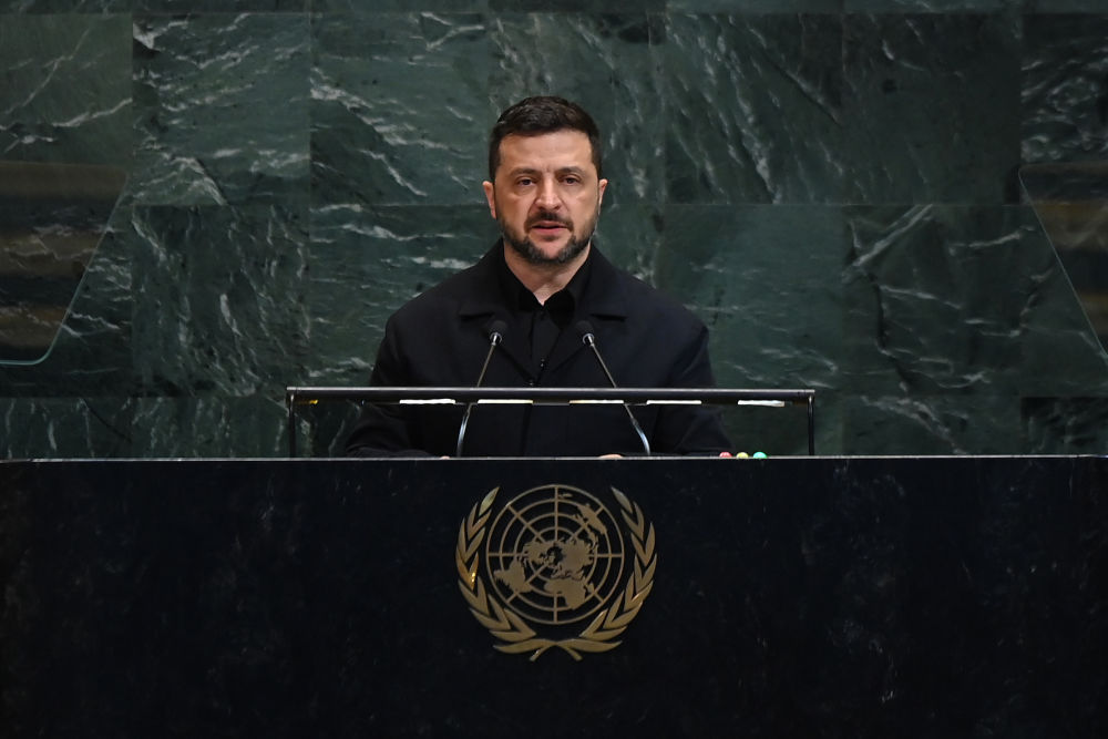 9月24日,在位于纽约的联合国总部,乌克兰总统泽连斯基在第80届联合国大会一般性辩论上发言。新华社记者 李睿 摄