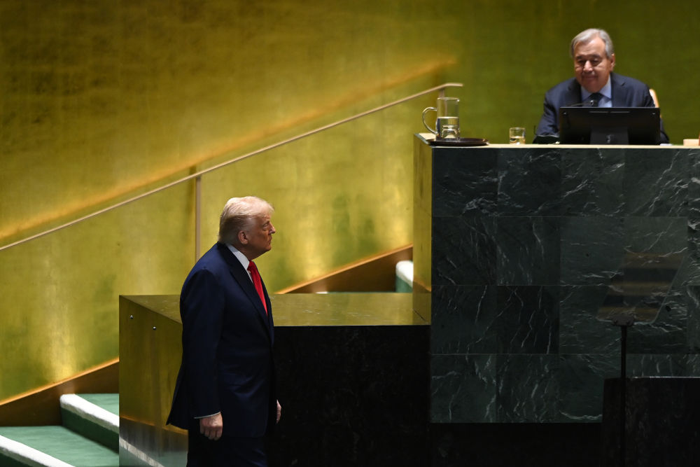 9月23日,在位于纽约的联合国总部,美国总统特朗普(左)在第80届联合国大会一般性辩论上准备登台发言。新华社记者 李睿 摄